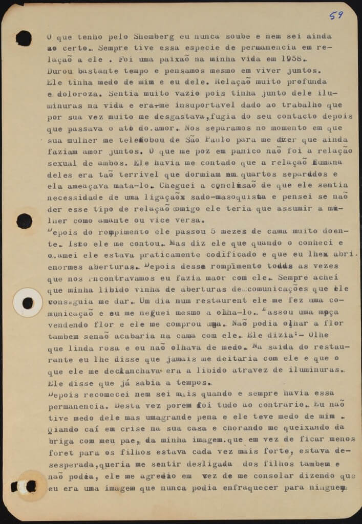 Ele tinha medo de mim e eu dele. Relaçaõ muito profunda e doloroza. Sentia muito vazio pois tinha junto dele iluminuras na vida e era-me insuportavel dado ao trabalho que por sua vez muito me desgastava, fugia do seu contacto depois que passava o ato do amor. Nos seperamos no momento em que sua mulher me telefonou de São Paulo para me dizer que ainda faziam amor juntos. O que me poz em panico naõ foi a relaçaõ sexual de ambos. Ele havia me contado que a relaçaõ humana deles era taõ terrivel que dormiam em quartos separados e ela ameaçava mata-lo. Cheguei a conclusaõ de que ele sentia necessidade de uma ligaçaõ sado-masoquista e pensei se naõ der esse tipo de relaçaõ comigo ele teria que assumir a mulher como amante ou vice versa.