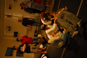 Proposition created by Lygia Clark in 1973, during the period in which She was teaching Sign Language at the Sorbonne University, in France. In the experiment, a participant wears a fabric jumpsuit with an opening in the belly area and lies down to be surrounded by others (all with their eyes closed). These people will "eat" the lying participant through that “hole” of the suit, where the artist placed lots of fruits to be bitten.