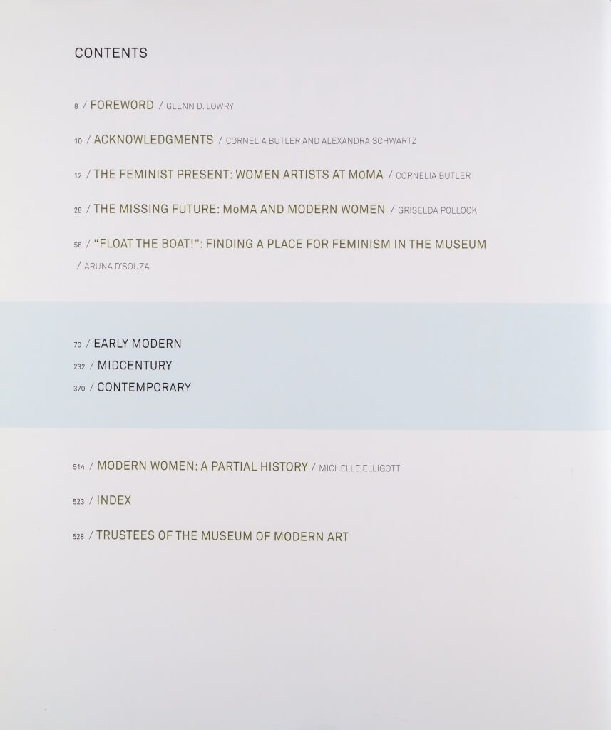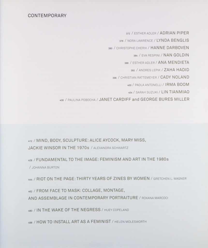 Coletânea sobre o acervo de arte feminista do Museum of Modern Art, traz ensaios que exploram a obra das artistas mulheres sob as perspectivas geracional e cultural.