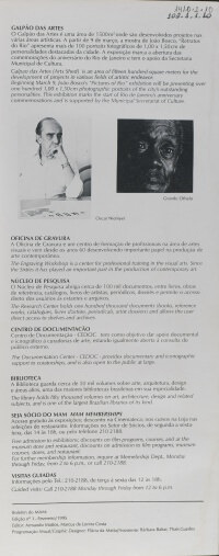 Prospecto de divulgação do MAM/ RJ sobre suas exposições em andamento. Destaque para a participação do MAM/ RJ na montagem de duas salas para a 22ª Bienal de São Paulo, em homenagem à Lygia Clark e Hélio Oiticica.