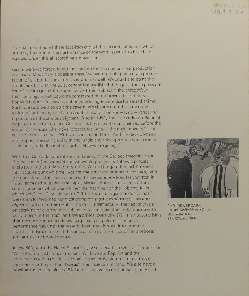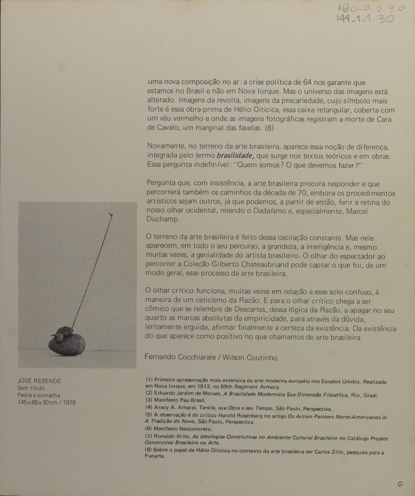 Catálogo da exposição "Do Moderno ao Contemporâneo/ Coleção Gilberto Chateaubriand - maio a julho de 1981", realizada no Museu de Arte de Moderna do Rio de Janeiro (MAM/ RJ) entre maio e julho de 1981, com acervo da Coleção Gilberto Chateubriand. A curadoria é de Fernando Cocchiarale em parceria com Wilson Coutinho. As peças refletem a produção brasileira do período entre 1920 e 1970, de artistas como Lygia Clark, Sérgio Camargo, Cildo Meireles entre outros.