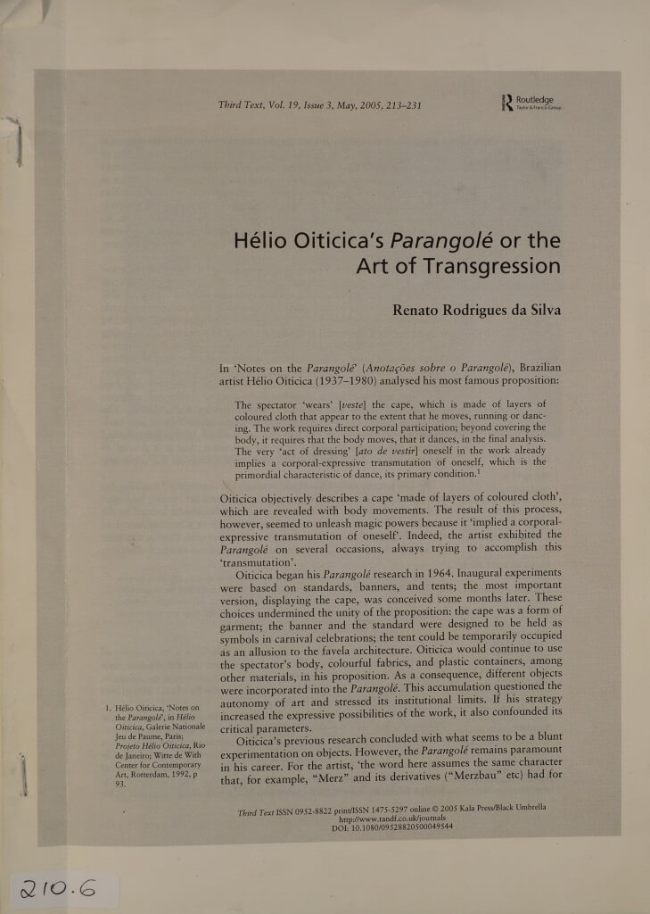 SILVA, Renato Rodrigues da. Hélio Oiticica's Parangolé or the art of transgression. Third Text, Londres, V.19, N.3, Maio 2005, p.213-231