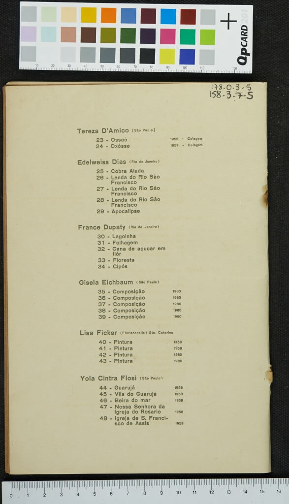 Catálogo da exposição "Contribuição da mulher às artes pláticas no país" realizada pelo Museu de Arte Moderna de São Paulo, entre dezembro de 1960 e janeiro de 1961. A exposição contou com a participação de Lygia Clark, com a obra "Contra Relevo nº 7", de 1959 - madeira pintada.
