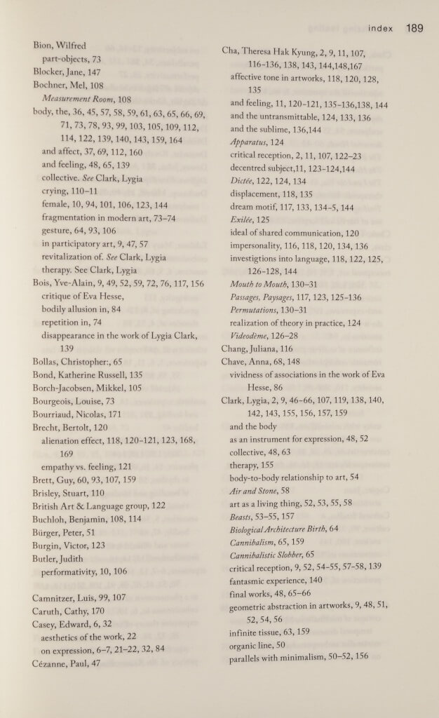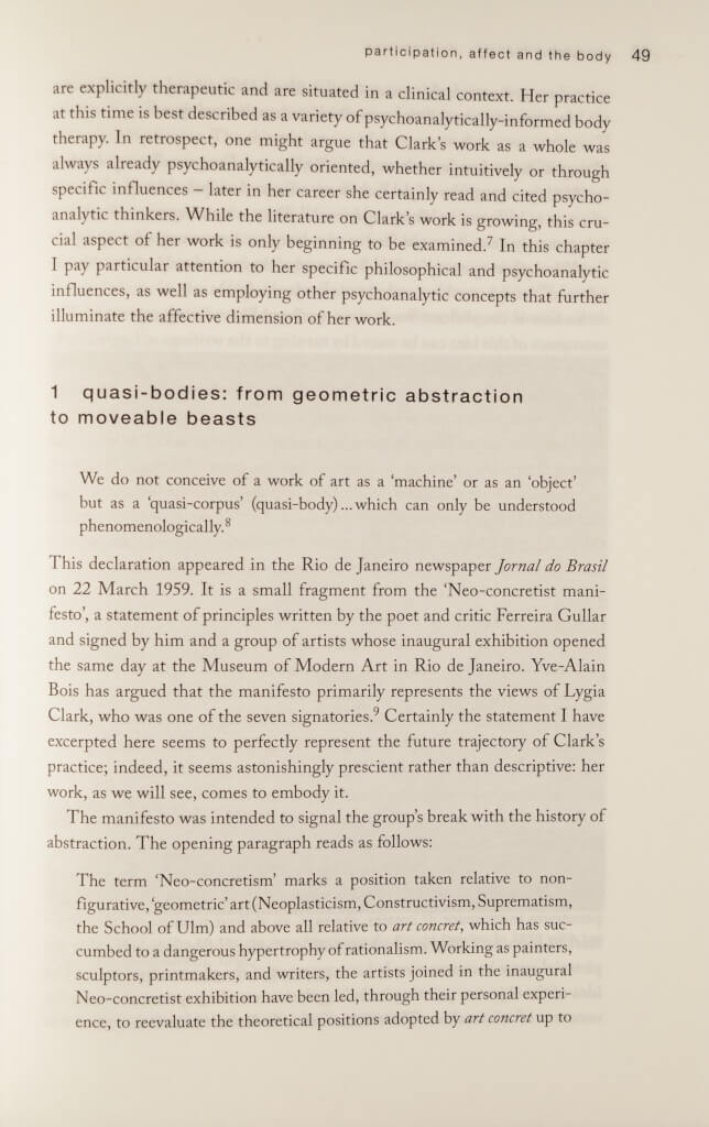 Explora a forma como a sua arte transformada protocolos de vanguarda estabelecidos através da introdução de uma dimensão afetiva. A parte que é referente a Lygia Clark possui texto retratando sobre vários de seus trabalhos.